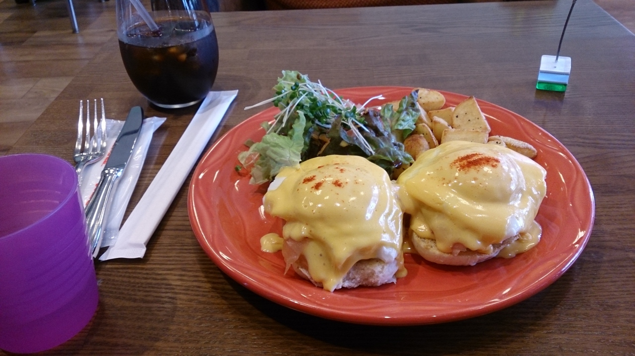中途半端な時間の朝10時半すぎに行きましたが、そんな時間でもお客さんは結構いて、川を見渡せるテラス席はほとんど埋まっていました。おなかがすいてきていたので、エッグベネディクトを注文。ゴールディロックスというスモークサーモンとアボカドの入ったベネディクト。最初はおいしい!と思ったのですが、卵2個分にトリュフで味付けされたオランディーソースがたっぷりかかって、少しヘビーでした。私には1個でよかったかな~。これにアイスコーヒーをたのんで2000円超えにはちょっとびっくり…。