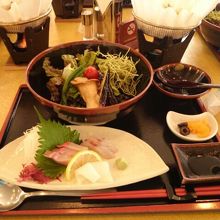 レストランでヘルシーな醤丼を食べてから売店でお買い物。 1万円以上の買い物で送料無料のサービスがあり、重たいオリーブオイルや麺類をまとめて宅配できて良かったです。
