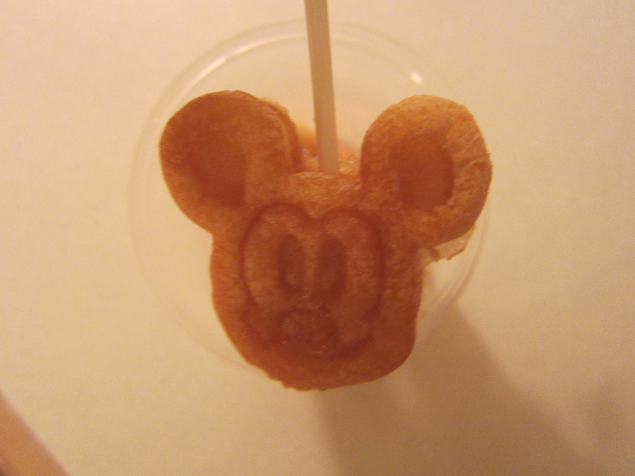 ミニのミッキーワッフルがカップに入って、メイプルソースが別についていました。ホテルに持って帰って、夜食にしました。大きなミッキーワッフルは、アツアツサクサクでおいしいです。ミニミッキーは、冷たいですが、持ち運びができます。夜8時過ぎると並ばずに買えました。