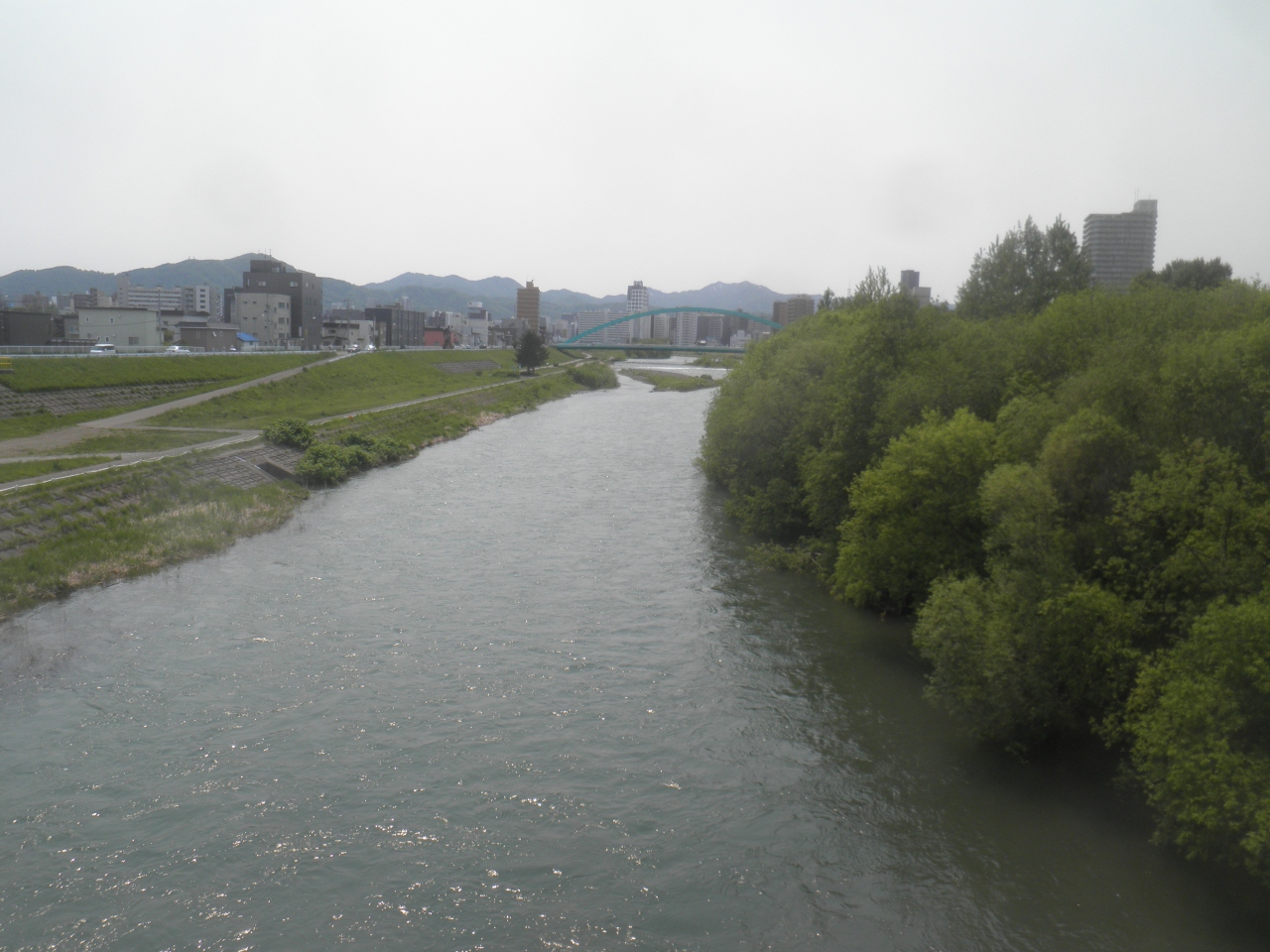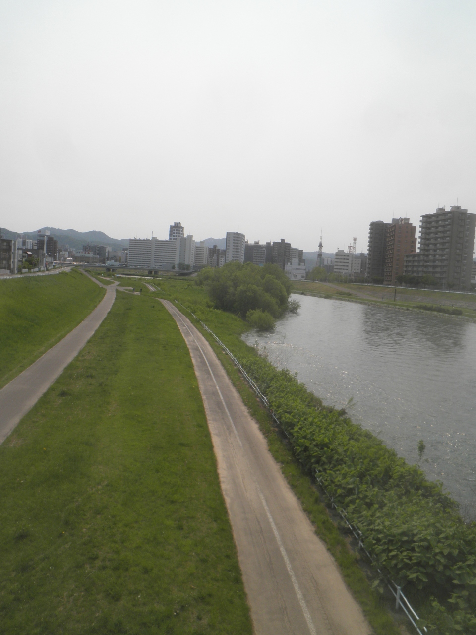 水穂大橋は札幌の市街市を流れる豊平川にかかる緑色のアーチ橋で、この下を豊平川サイクリング園路 がとおっています。 5月の休日でもあまりサイクリングをしている姿はみかけませんでした。 サイクリングロードは川岸にあるので、護岸から下れるところは限られています。