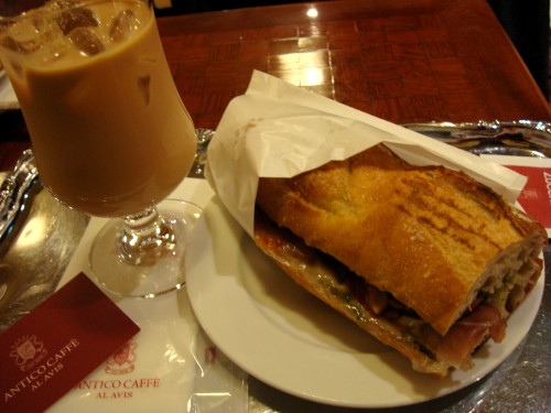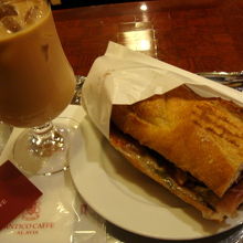アイスコーヒーとグリルドベジーとチーズがいっぱい入ったサンドウィッチと、