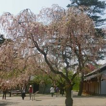 たずねたとき、建物の前のサクラが咲き残っていた。