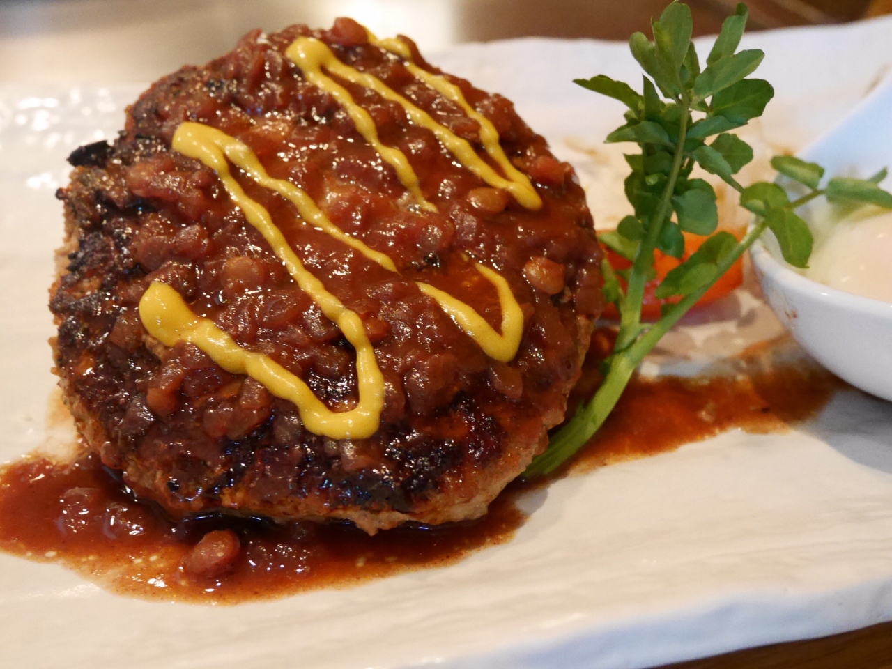 デミ系のソースには、ビーンズらしきものが入っており、ハンバーグとよく合うソースでした。
