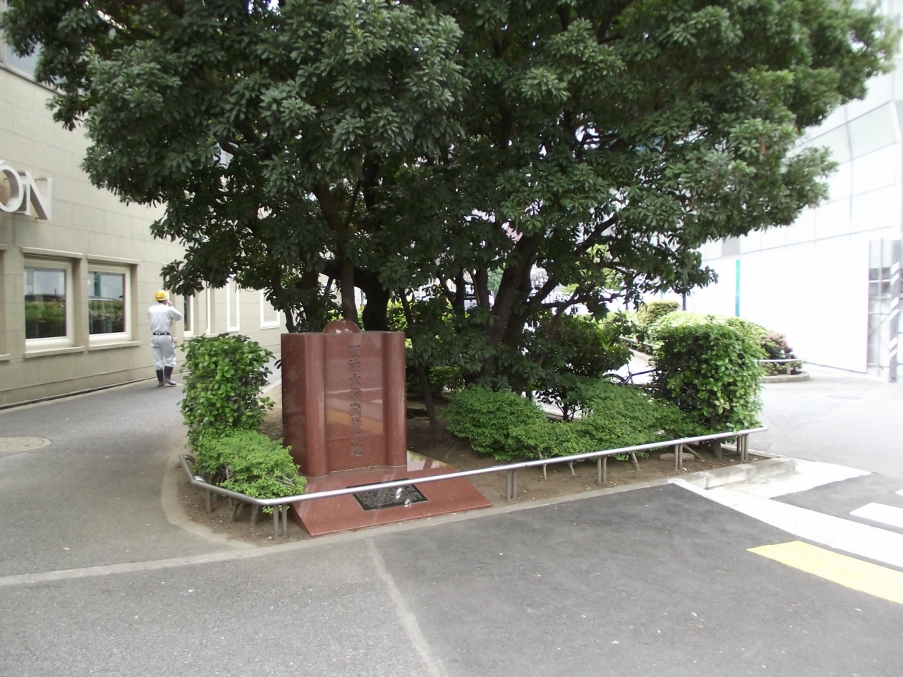 場所は、現在は工事中だがニュートーキョービルと高速道路の高架との間で、晴海通り沿いの小さな緑地の前面にあり、晴海通りを向いています。