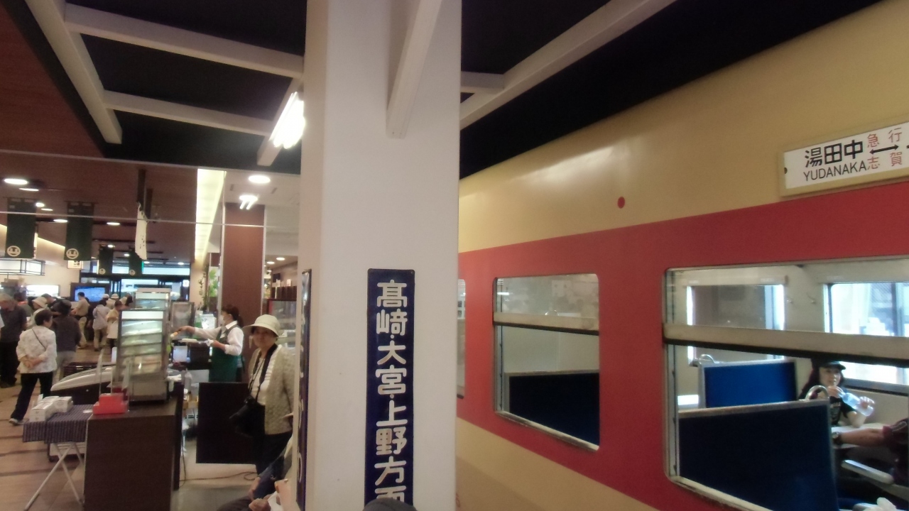 店内では、横川駅をイメージさせる実物サイズ模型電車がありました。中で食事も出きるので、釜飯を電車で食べている気分にもなれますよ。