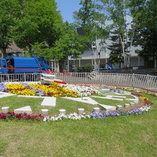 きれいな花が植えられていて、その上を大きな時計の針が回っています。