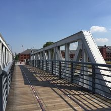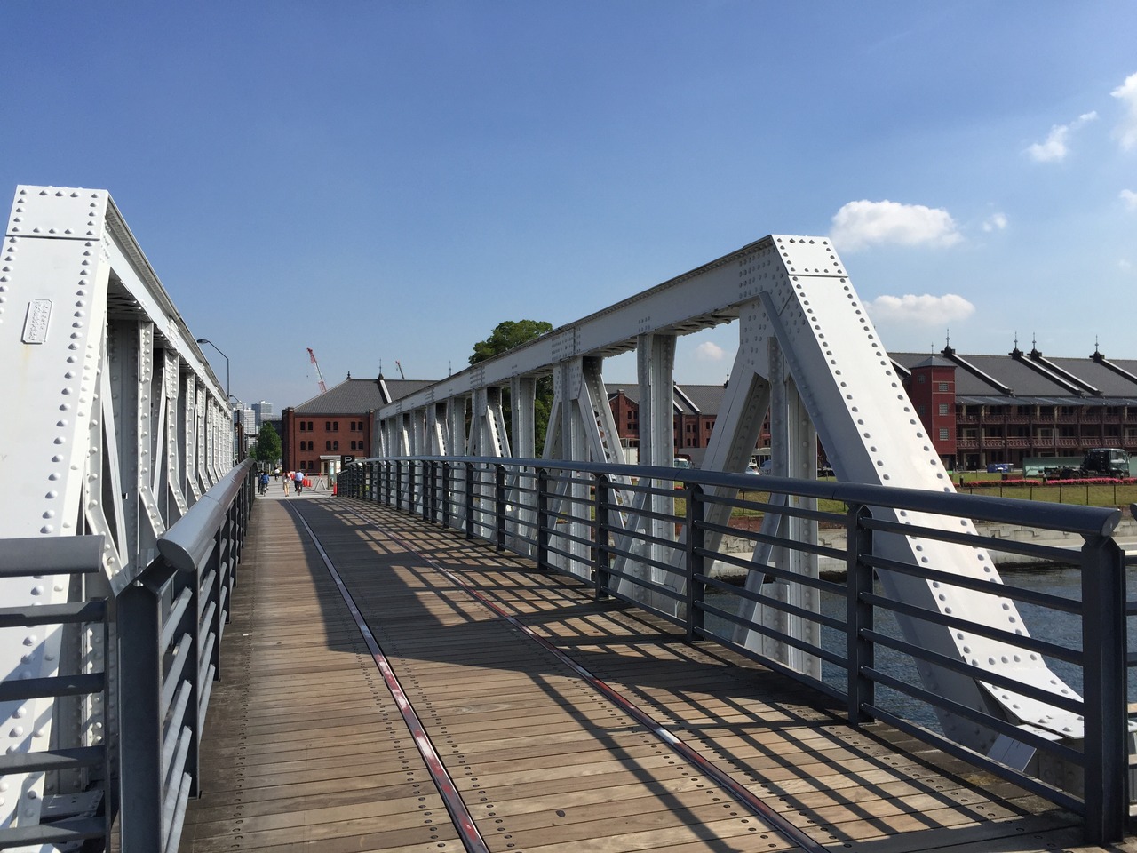 赤レンガ倉庫から象の鼻パーク方面に行く際に、通る橋で、線路が埋め込まれています。もともとは臨港線の貨物線用の橋として、この場に設置されたようです。築造は大正元年で、今は横浜市の歴史的建造物に指定されており、多くの観光客が通る橋となっています。