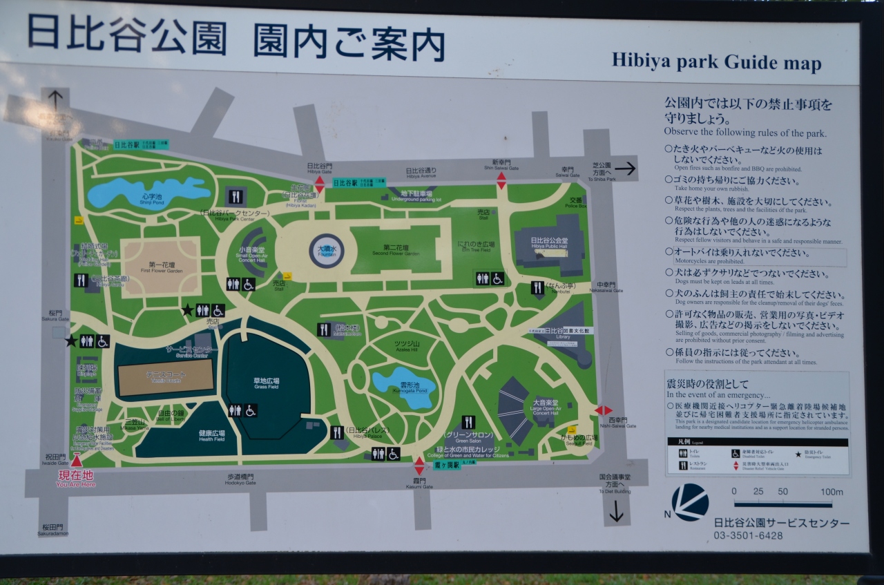 公園面積は16.1ヘクタール、都内有数の公園で、市政会館、日比谷公会堂、大小の野外音楽堂、日比谷図書文化館、「緑と水の市民カレッジ」、日比谷グリーンサロン、また園内には大小の花壇があり、四季折々の花と緑が都会にいることを忘れさせてくれる。