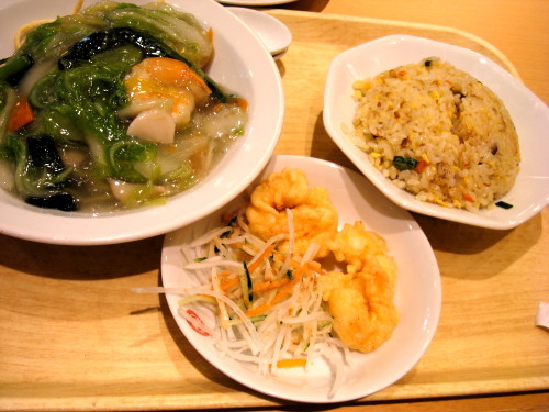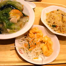 固やきそばとチャーハン、エビてんぷらのセット
