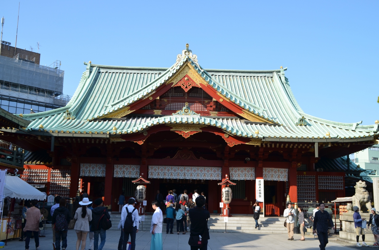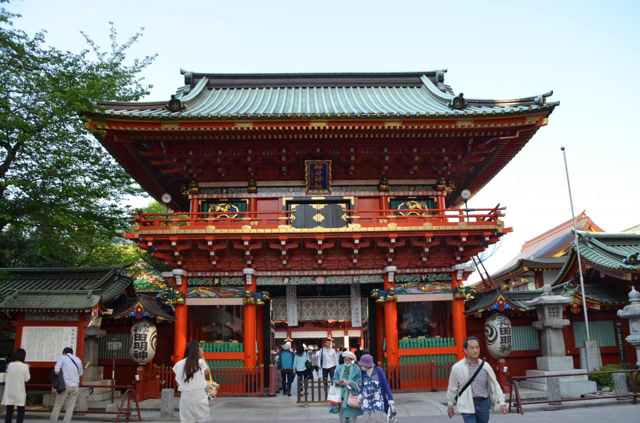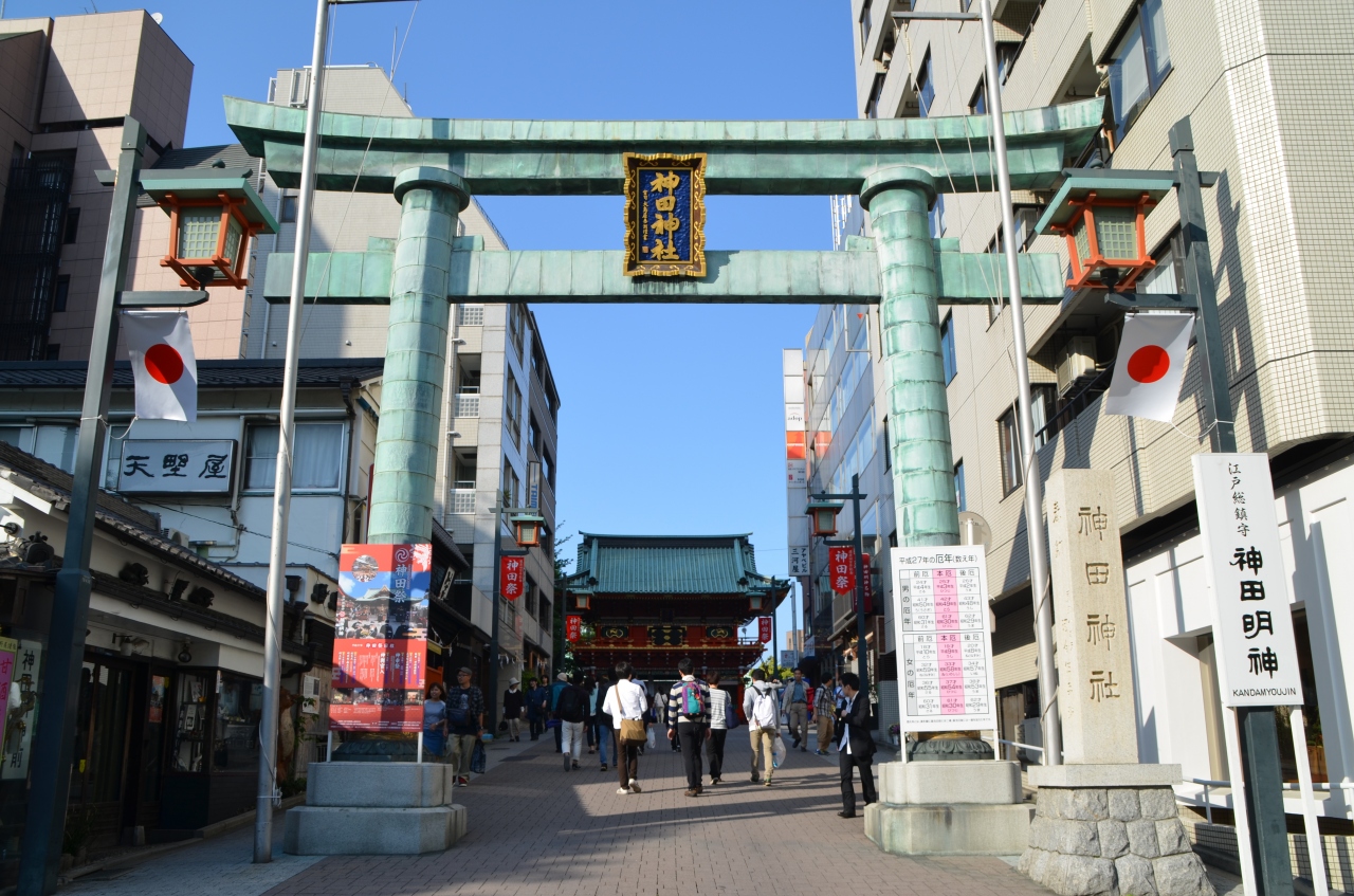 神田明神の正式名称「神田神社」。神田祭をおこなう神社で、神田・秋葉原・大手町・丸の内・旧神田市場・築地魚市場など108か町会の総氏神である。江戸初期に豪華な桃山風社殿と権現造の社殿が造営されたが、1923年の関東大震災で焼失した。その後、当時では珍しい鉄骨鉄筋コンクリート構造で権現造を模して再建されたことから、1945年の東京大空襲では、境内に焼夷弾が落ちたにもかかわらず本殿・拝殿などは焼失を免れた。神田祭は江戸三大祭りの一つで、山車は将軍上覧のために江戸城中に入ったので、「天下祭」と言われる。