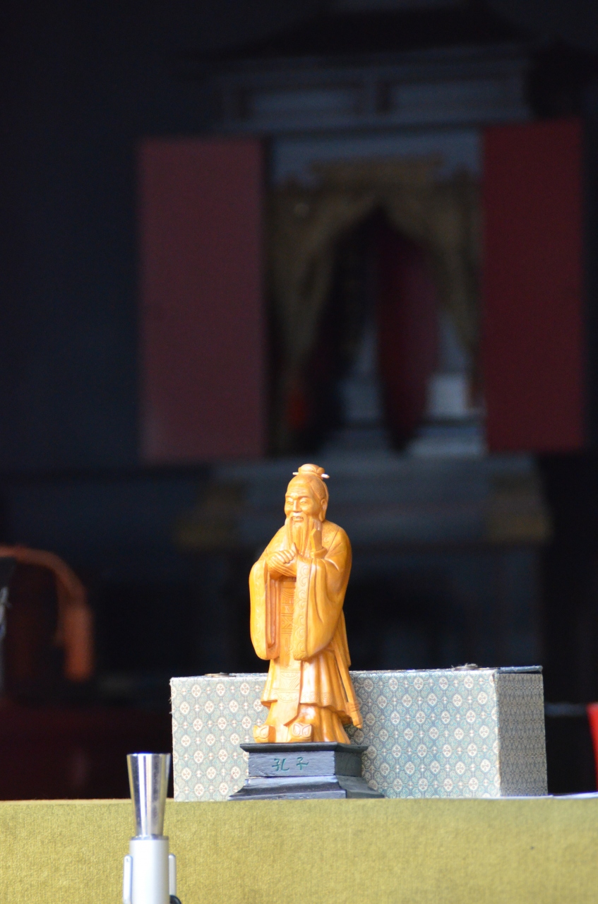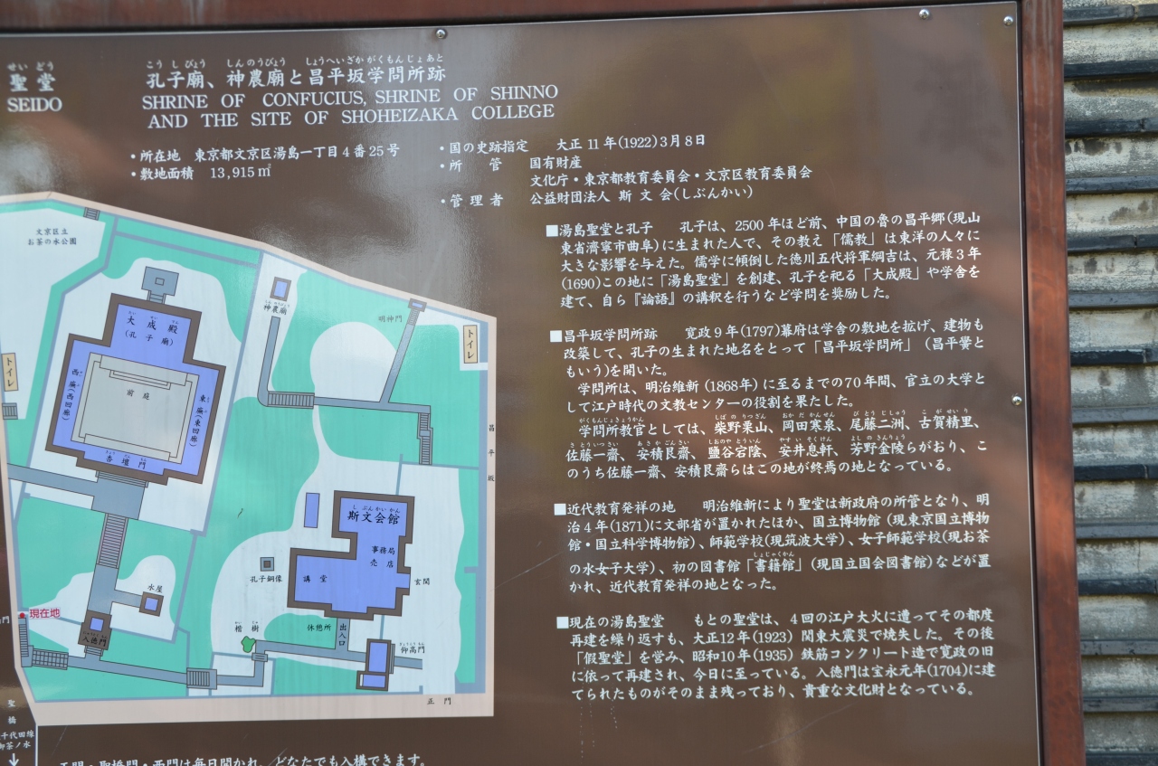 湯島聖堂は、元禄時代、5代将軍徳川綱吉によって建てられた孔子廟である。1690年に林羅山が上野忍が岡(現在の上野恩賜公園)の私邸内に建てた忍岡聖堂「先聖殿」に代わる孔子廟を造営し、将軍綱吉がこれを「大成殿」と改称して自ら額の字を執筆した。またそれに付属する建物を含めて「聖堂」と呼ぶように改めた。翌1691年に神位の奉遷が行われて完成した。林家の学問所も当地に移転している。1923年の関東大震災で入徳門と水屋以外の建物が焼失し、現在の大成殿は1935年に鉄筋コンクリート造で再建されたものである。