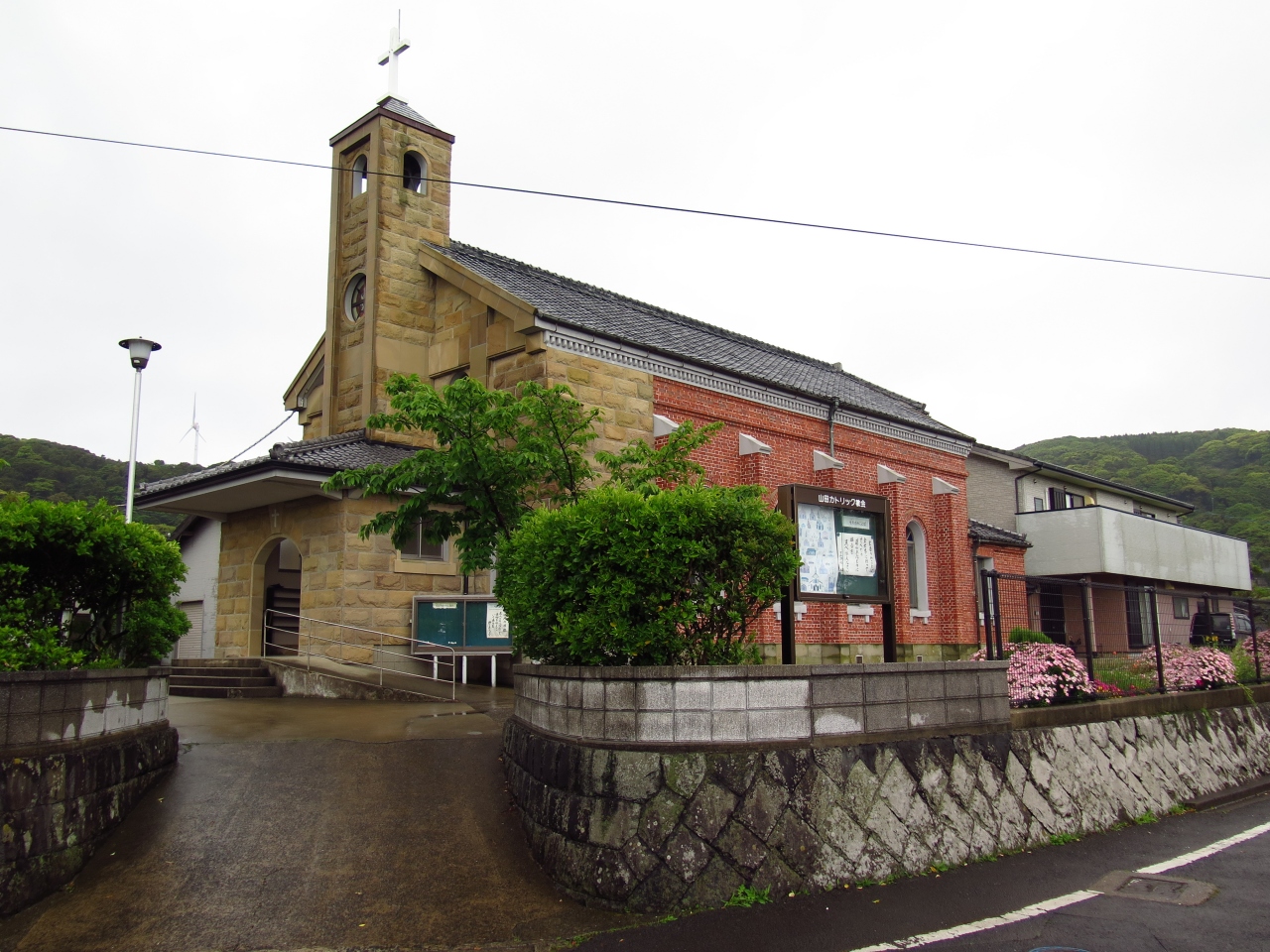 1912年に建てられた教会で、設計は明治から大正にかけて長崎近隣の数多くの天主堂建築に携わった鉄川与助氏によるものだそうです。ミサの時以外、見学は自由にさせてもらえます。レンガ造りの内部は写真撮影禁止でしたが、主廊の両側に側廊を持つ3廊式で、天井は丸いアーチが連なるこうもり天井。艶のある茶色の柱と祭壇の上のステンドグラスが美しく印象的でした。