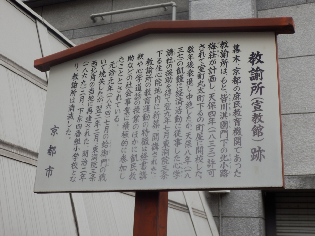 京都の三条通にあるレトロなビル街を散策,中京郵便局の西に,教諭所跡と記した石板が設置されていた、江戸時代末期,京都で一般市民の教育機関として開設された私設の機関であったが明治二年この地に,京都市立下京四番組小学校が開校されたときまで存続していたとされている,同所横に,京都電信発祥の地の石碑もあり、ふるい時代から開けた都市として機能を発揮していた様です、参考文献:現地に京都市が設置した立札