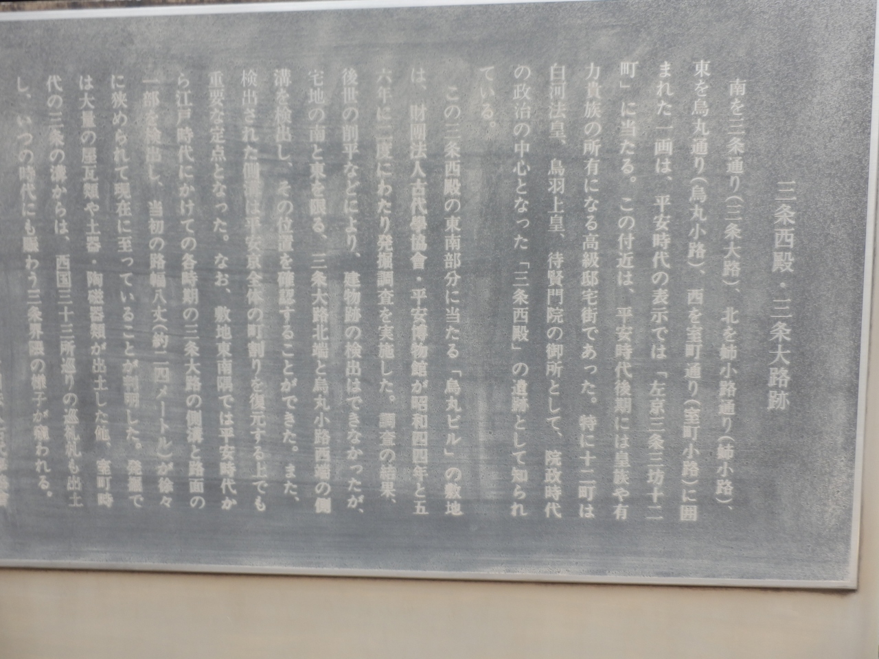 古都京都には至る所に平安時代以降の遺跡が埋もれている、今は、コンビニやビル街となり当時の姿など伺いしれないが、発掘調査の結果当時の遺構があったとした立札が設置されていた、この地は平安時代では,左京三条三坊十二町と称されていたそうだが京都の地名の名づけ方法を知るとどこにあるか一発でわかる仕組みになっているのは先人の知恵の、素晴らしさが垣間見れます、この十二町は現在の室町通,三条通、烏丸通、姉小路通で囲まれた範囲だとされており、京都のビジネス街として繁栄している所です、参考文献*財団法人古代學協會が設置した立札