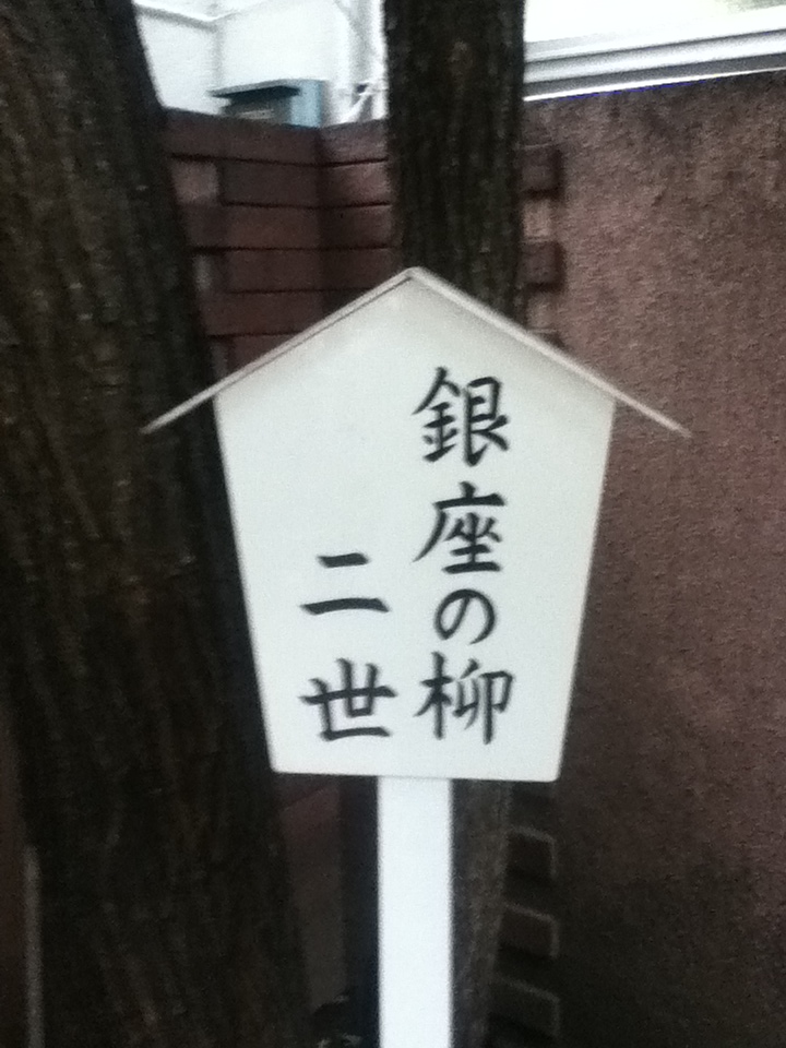 JR有楽町駅の北西、泰明小学校の校舎の入口横にこちらの柳がある。横には、島崎藤村 北村透谷記念碑がある。柳は細い枝だがしっかりとし緑色の葉も元気そうである。銀座の柳は、大正時代車道の拡幅工事に伴い撤去されたが、昭和7年に2世として再び銀座通りと晴海通りに復活した。特に柳の木やこの界隈に関心や知識がある方には、訪問することをお勧めする。