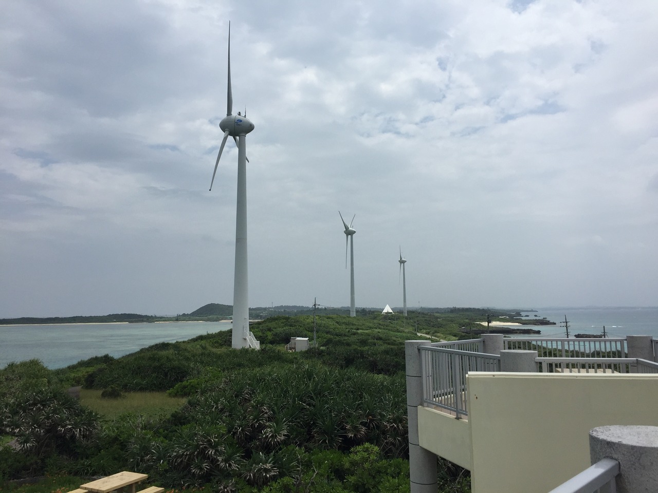 沖縄電力の大きな風車が三本建っているのが目印の西平安名崎。駐車場わきの展望台(小さいが)からの眺めは実は思った以上に良いです。池間大橋と池間島、大神島が見える方向と真反対には伊良部島。どちらを向いても楽しめる眺望です。