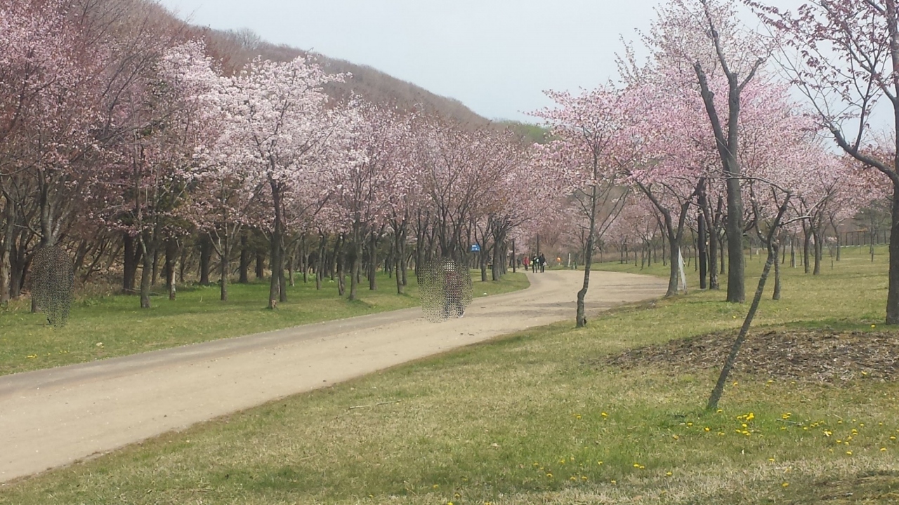 幅の広い遊歩道の桜並木がとても綺麗です。