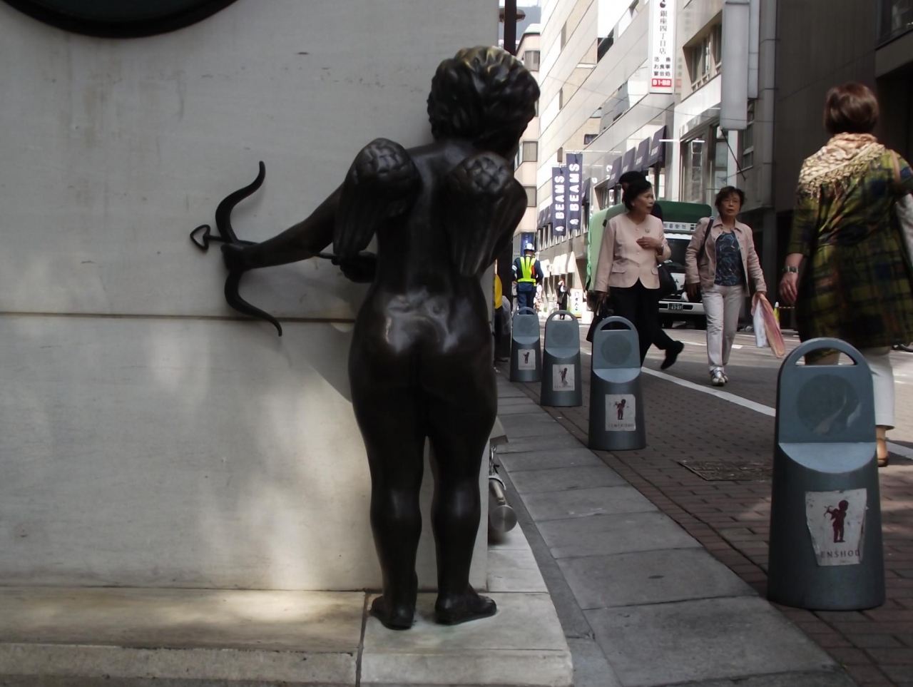 白い壁にソット隠れ、今にも矢を射ろうとしている後姿は、何とも言えない可愛らしさがあります。