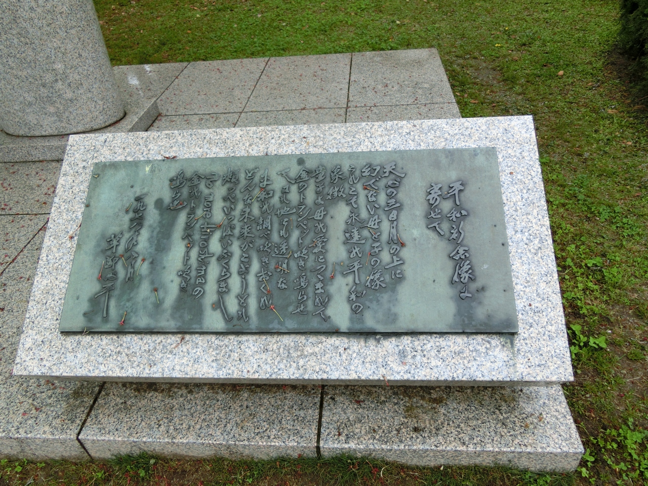 平和記念公園の真ん中あたりの慰霊碑の西側の木立の中にある、台座の三日月と子供を抱いた裸婦像です。