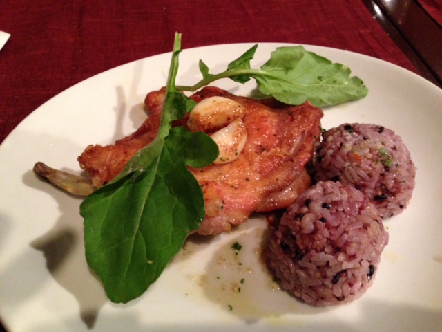 赤ワインのフルボトルと、季節限定のハーブサラダ、ピザ、パスタ、チキンのソテー(付け合わせの五穀米がおいしかった)をたのみました。