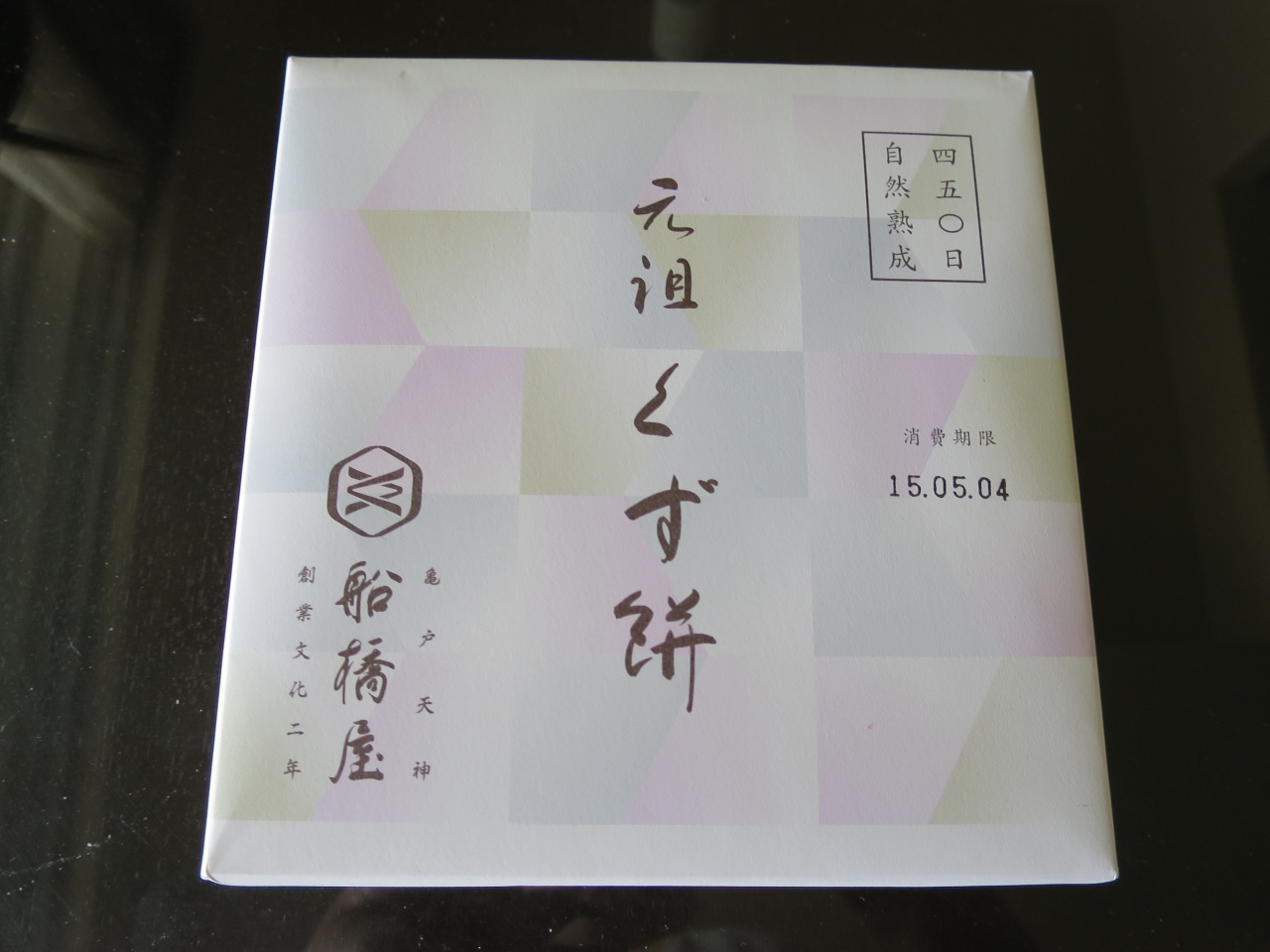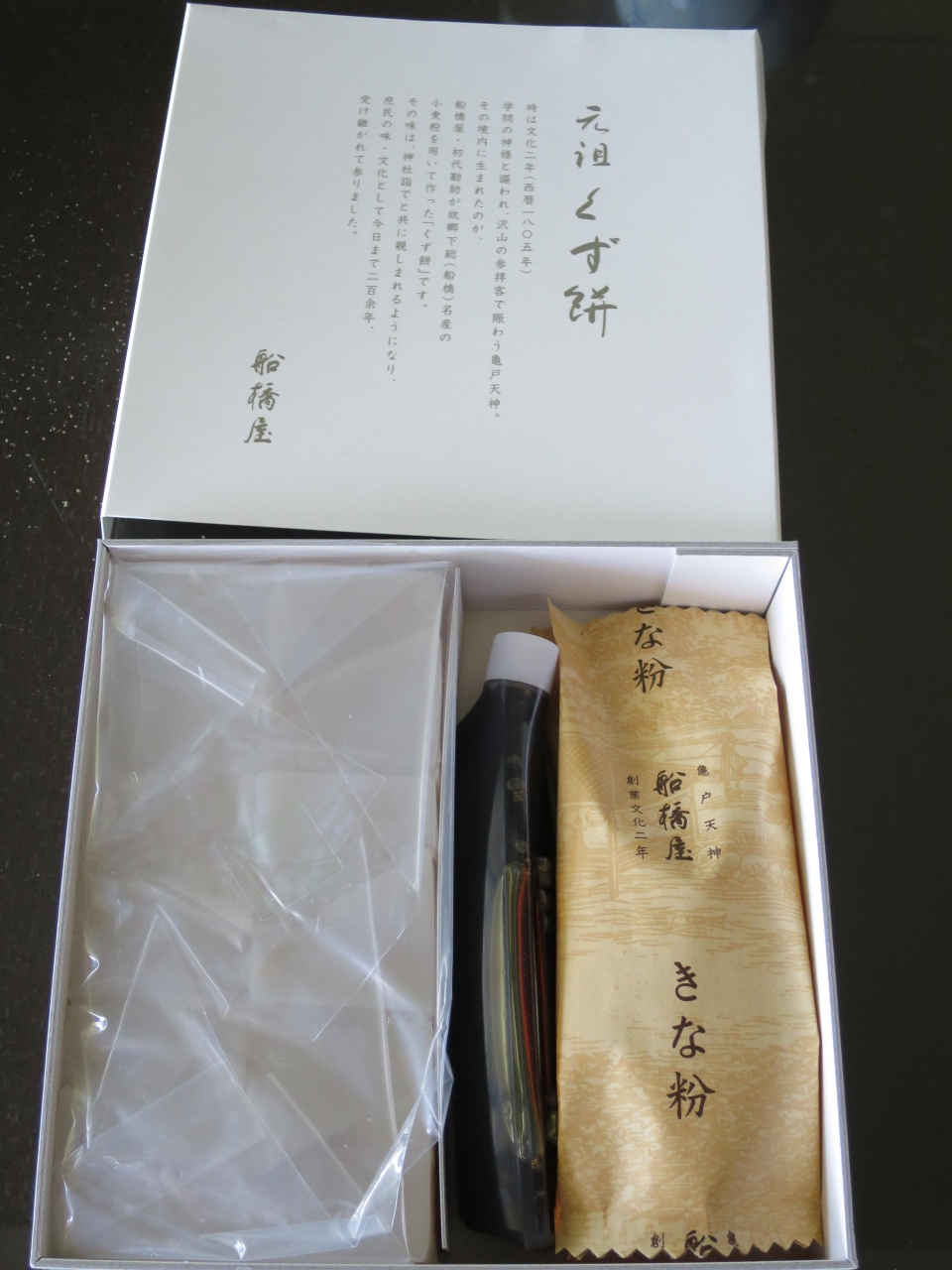 東北道 羽生上りPAの鬼平江戸処にくず餅の名店 船橋屋が入っています。亀戸の名店が何故、埼玉に店を出しているのか分かりませんが、21時まで営業しており、御土産としてくず餅を買えました。