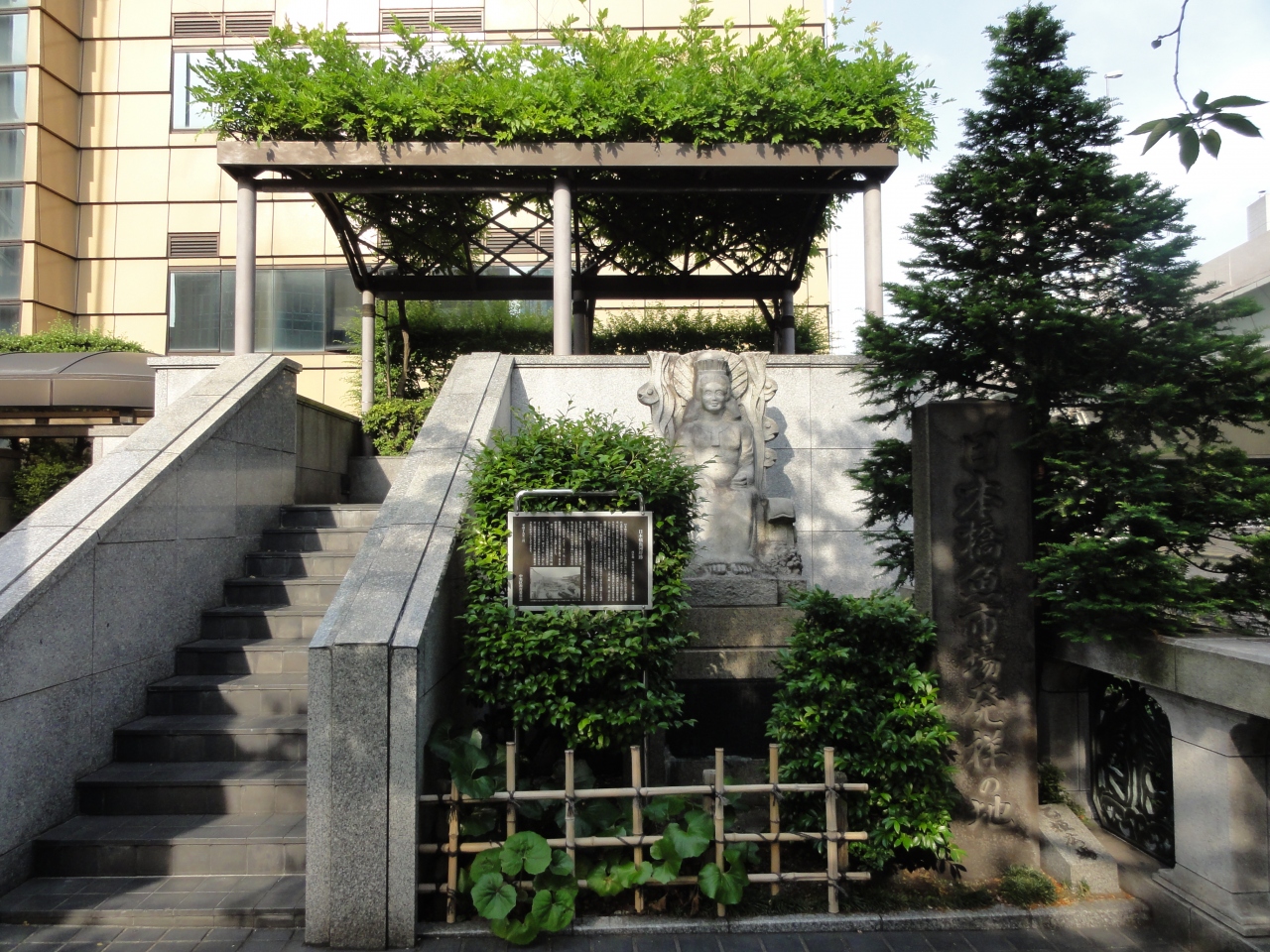 日本橋のたもと、日本国道路元標と通りを挟んだ反対側にあります。魚河岸の由来を説明した解説板があり、女性の石像がある乙姫広場と一緒の公園です。解説板の後方は階段があり、藤棚のある展望台みたいな施設があるので日本橋が良く見えます。