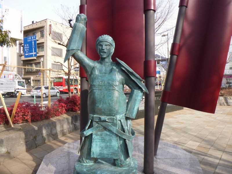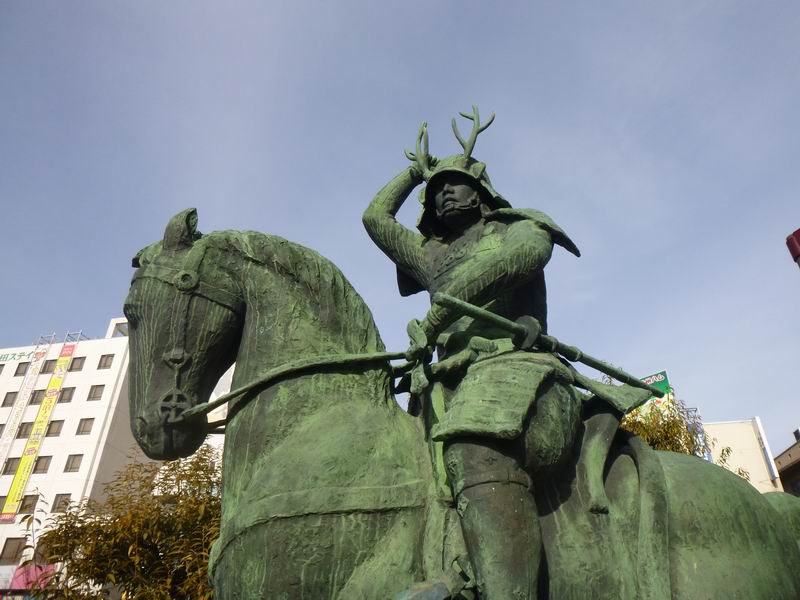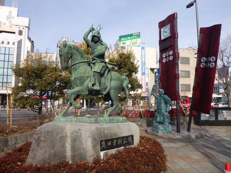 上田駅お城口のロータリー内にある真田信繁(幸村)の騎馬像。上田といえば真田氏の城下町というイメージがありますから、観光で訪れた人が記念に写真を撮るにはぴったりな像かと思います。駅を出てすぐなので、非常にアクセスしやすいです。騎馬像の後方には真田家の家紋である六文銭の幟の形をした時計台もありました。
