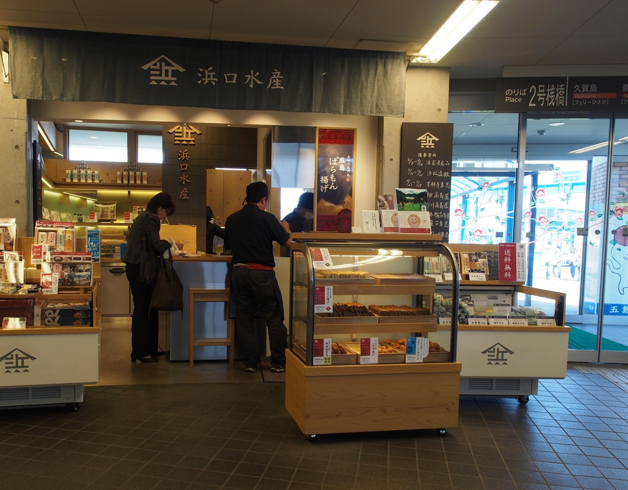 福江港のターミナル内に入っています。名物のかまぼこやさつま揚げがいろいろな種類が売られていました。お土産用にちゃんと箱詰めされたものもありますが、ひとつから買ってその場で食べられるものもあるのがうれしいです。