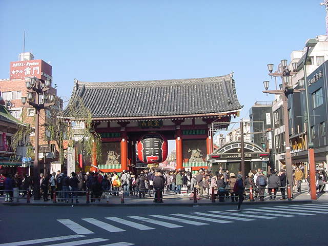 多くの観光客が集まる浅草ですが、にぎやかな街並みの中にいきなり雷門が現れます。まずは交差点の向かいに渡って遠景を見るのがいいですね。門の真下ではたくさんの人が記念写真を撮っています。門をくぐったらすぐに仲見世の店が並びます。