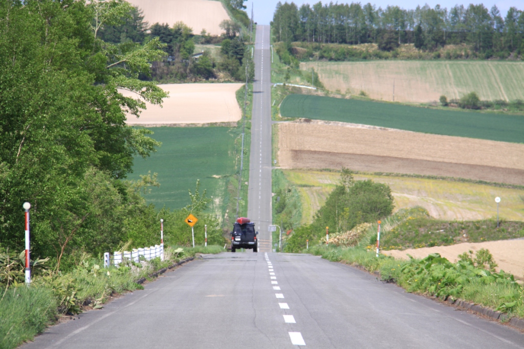 美瑛には、色々と魅力的な、本州にはなかなか無いような被写体があります。通称ジェットコースターの路とも呼ばれる、丘陵地帯をアップダウンしながら真一文字に貫く一本道。ちなみに真っ直ぐ感を出すには、センターラインの真ん中に立って撮るのがコツです。