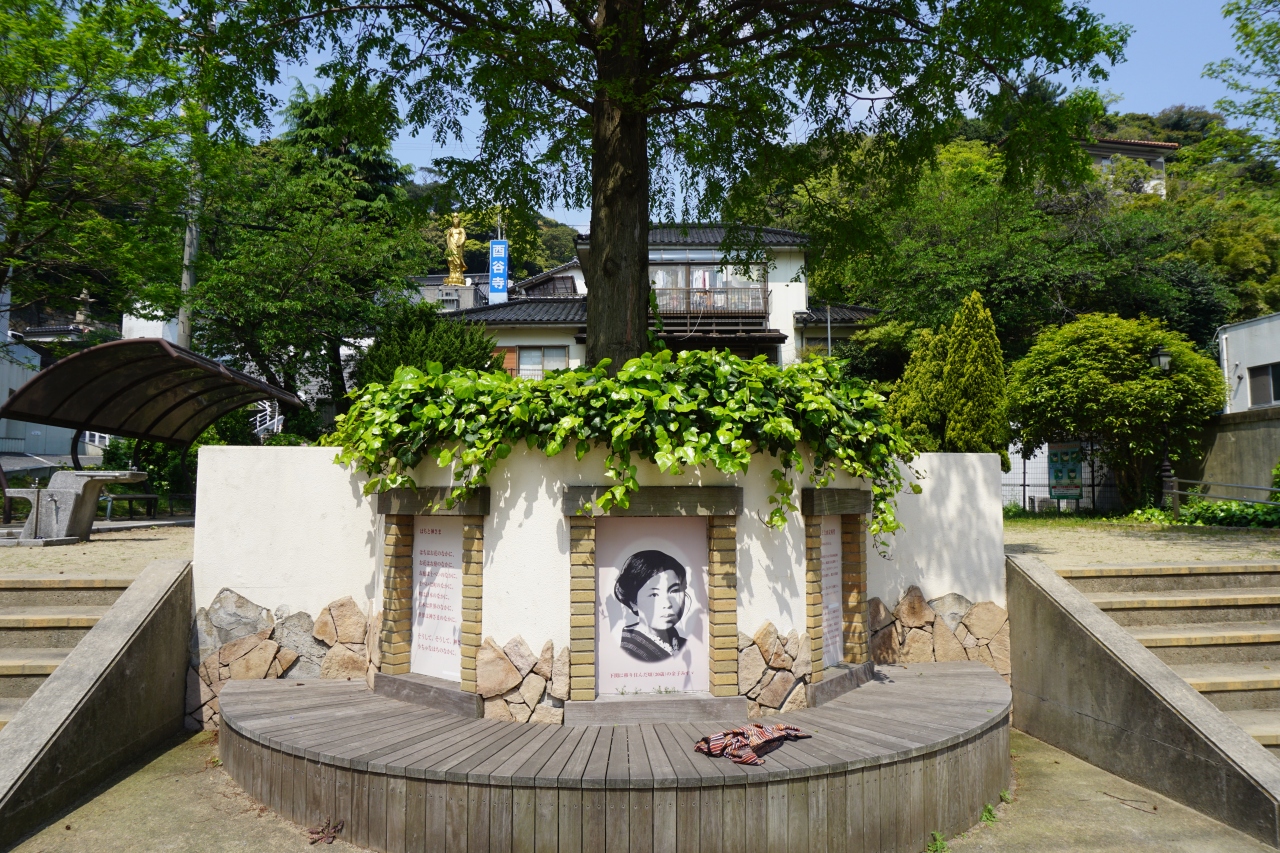童謡詩人金子みすゞは、大正12年に長門市の仙崎で生まれますが、その後、下関に移り創作活動を行います。市内には金子みすゞゆかりの地が点在しており、この顕彰碑のある寿公園もその一つ。みすゞの20歳の写真と紹介文は、平成10年に設置されたもの。何気なく歩いていても、すぐにそれと気づきます。
