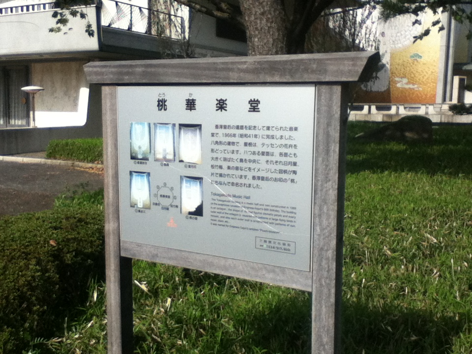 東御苑の北西エリア、天守台の東側にある。芝生の広場には多数の人がいるものの、天守台の周辺の広場から離れているせいか、近くまで来る人は大変少なく静かであった。建物は、花弁のような形状の屋根と八面体の外壁で各面とも大きな鳥の絵が描かれていて、なかなか立派である。桃華楽堂は、香淳皇后の還暦記念として建てられた音楽堂である。近くの天守台や本丸跡の芝生の広場等と併せて、訪問することをお勧めする。