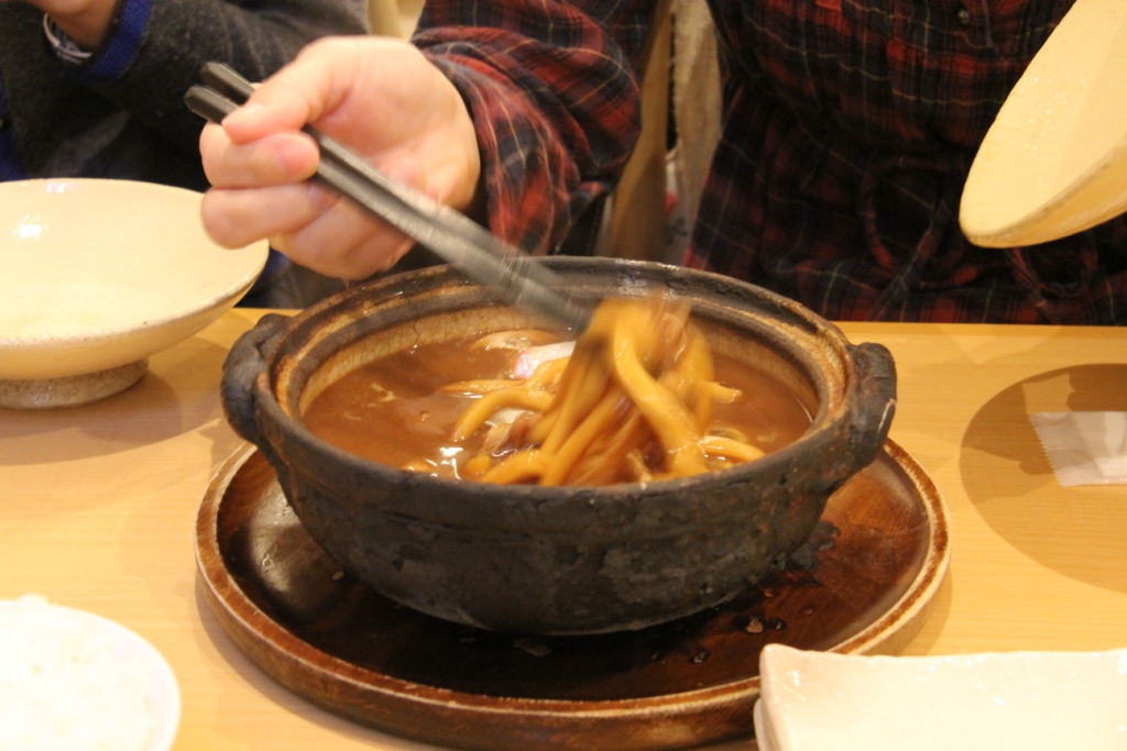 うどんは、この年季の入った土鍋で出されます。テーブルに着いた時点でもまだグツグツと音を立てていて、蓋は受け皿代わりに使うのが作法だとか。麺は最初少し芯が残ったような感じの固さです。
