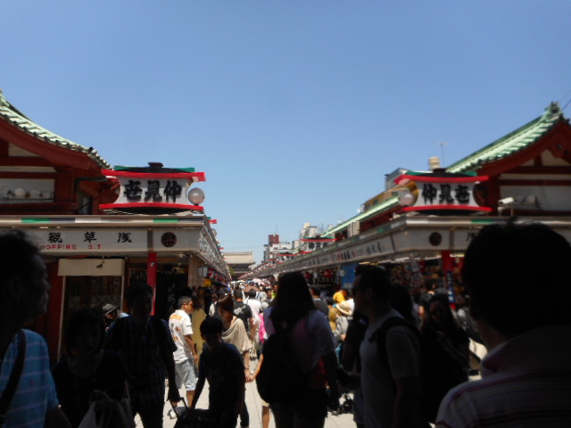 雷門から、この仲見世通りを歩いて浅草寺まで向かいます。通りの両脇は煎餅、甘味、お土産用品店、外国人も欲しがる日本の法被、浴衣などの着物店と、びっしりと店舗が軒を並べて、大勢の観光客が隙間もない程、歩き、ごったがえしています。