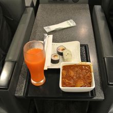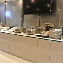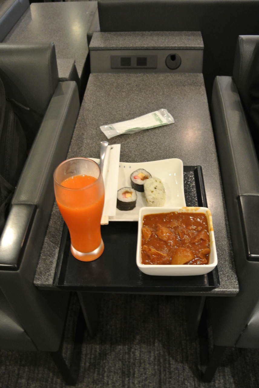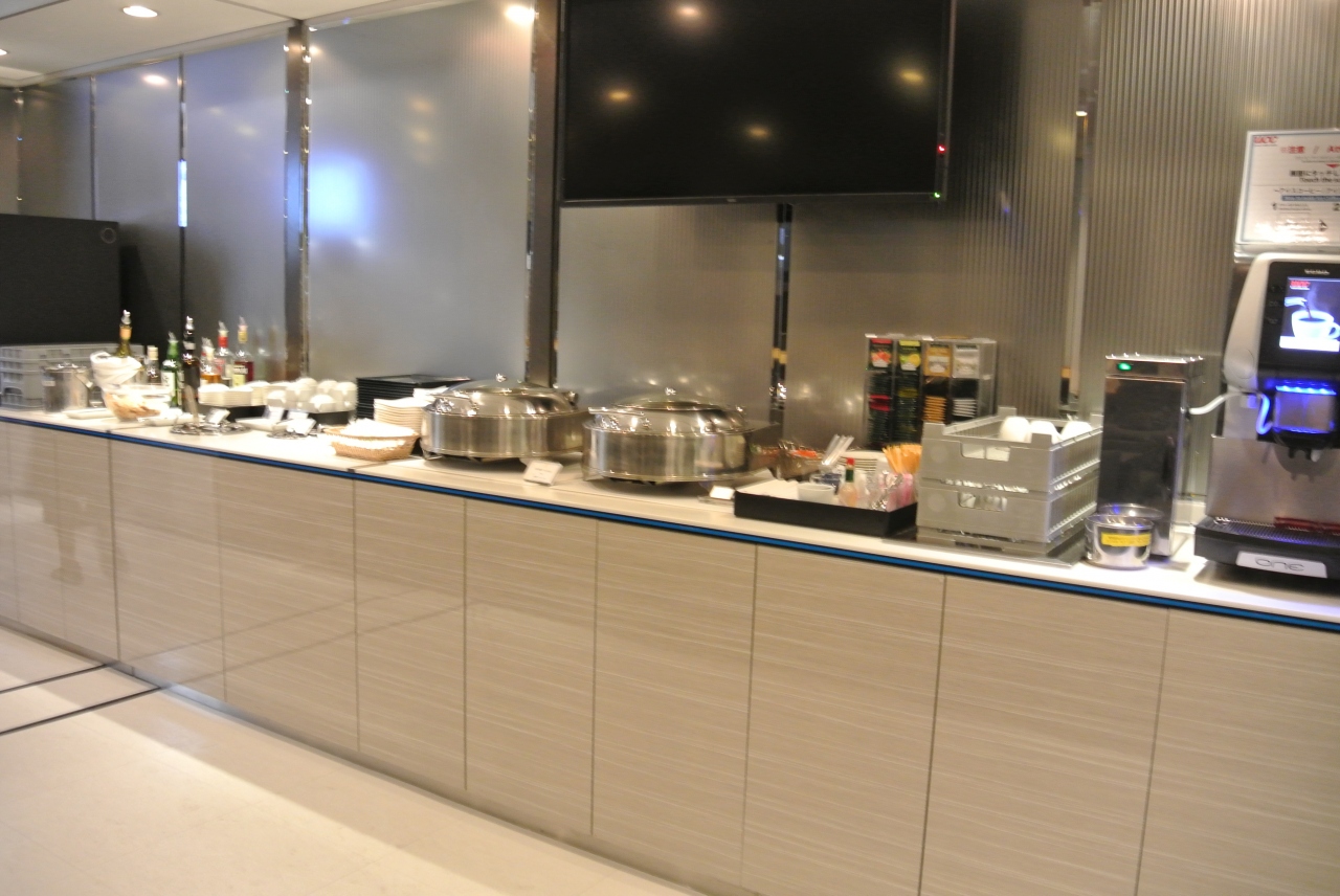 ラウンジは茶色や白をベースにした色調で落ち着いた感じです。食事類はチキンカレーがごろっとした具が入っていてとてもおいしかったです。巻きずしやおにぎりもおいしく頂きました。新聞の種類も多く、出発まで気持ちよく過ごすことができました。窓側のカウンター席に座っている人が多かったですね。