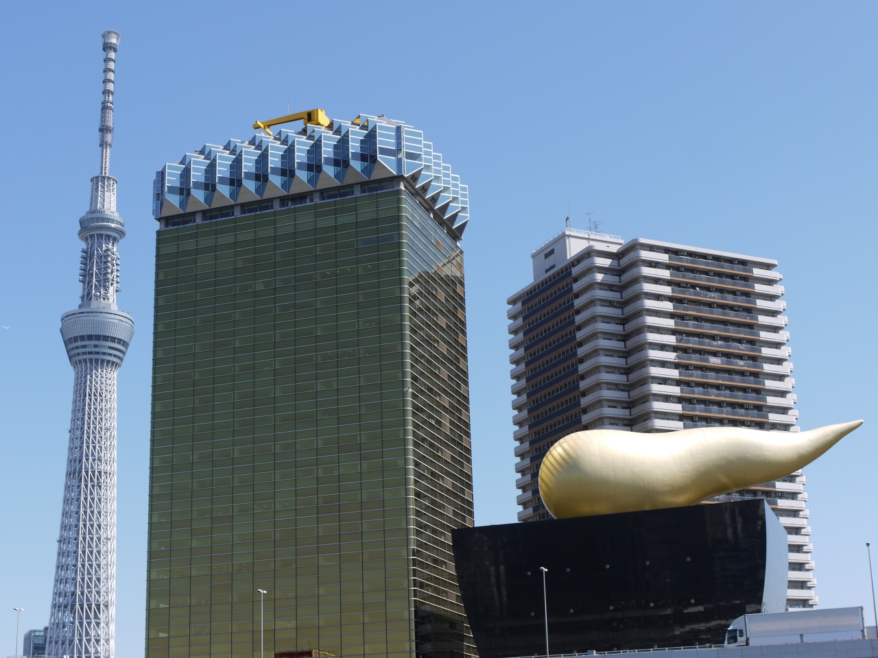 - 浅草駅を降りて橋を越えたところにアサヒビール社屋のシンボル、金の泡が見えます!