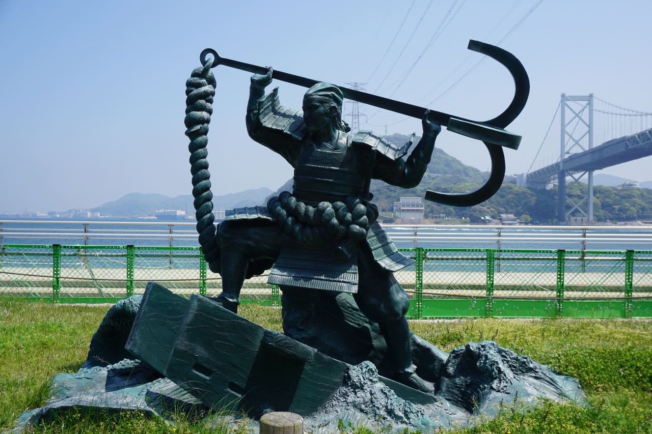 みもすそ川公園は、関門大橋を見上げる場所。まず目に付くのは、源義経と平知盛像。義経は八艘跳び、知盛は錨を担いだ姿で、両雄がまみえた姿が関門海峡をバックに生き生きと表現されています。他には、安徳帝御入水之処碑や長州砲のレプリカもあります。
