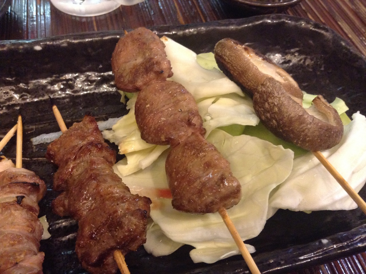 鳥皮5本、ささみしぎ焼き、とりみ、レバー、エンガワ、ハツ、中落ちカルビ、椎茸を注文。一本100円からと安いです。