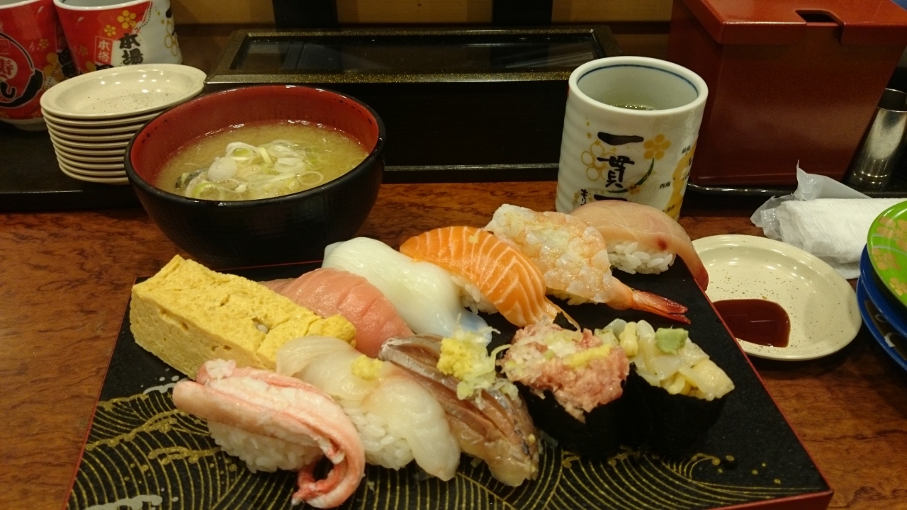 回転寿司屋さんですが、おまかせセット(アラ汁付き)をオーダーしました。