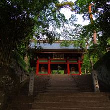 急な坂道を登るとある妙義神社の本殿へ向かう一番最初の門で鮮やかな朱色をしています。