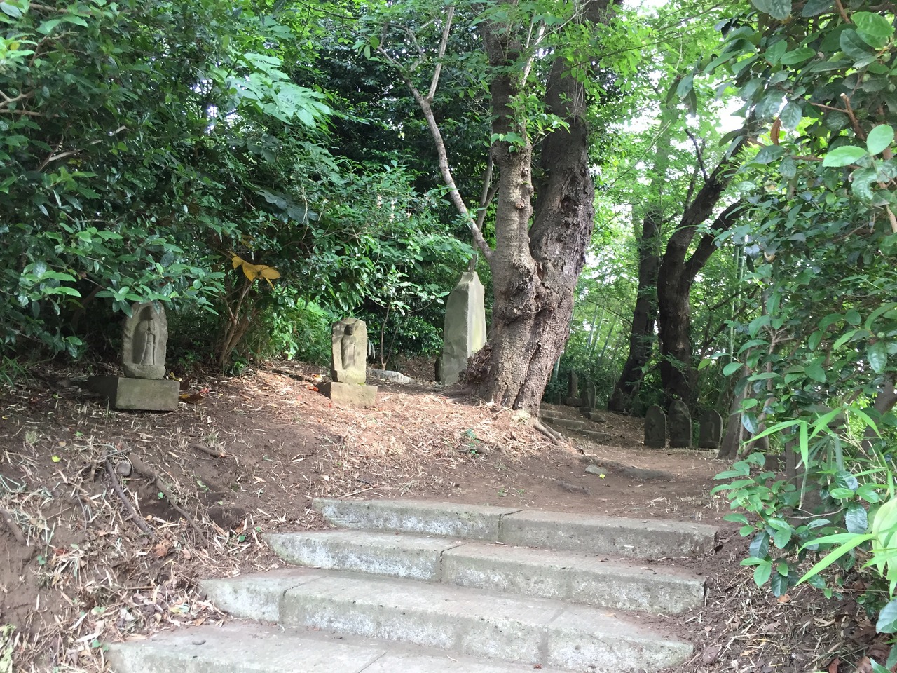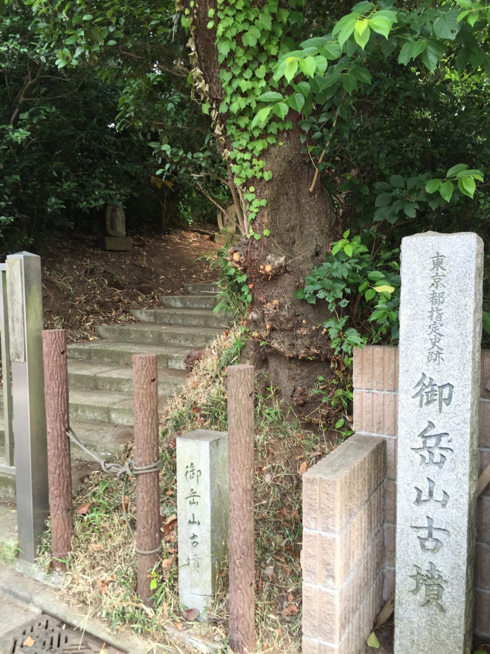 等々力渓谷から登り、等々力不動尊にでます。その目の前に目黒通りが走っていて、反対側にこんもりとした丘があります。これが御嶽山古墳で、入り口には都の教育委員会の説明書きがあります。簡単な門扉があり閉まっていましたが、かんぬきを外せば中に入れます。幾つかの石像がありました。