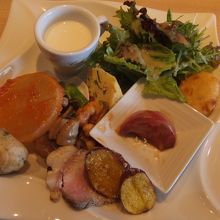 前菜は盛り沢山、彩りもきれいで素晴らしいです。