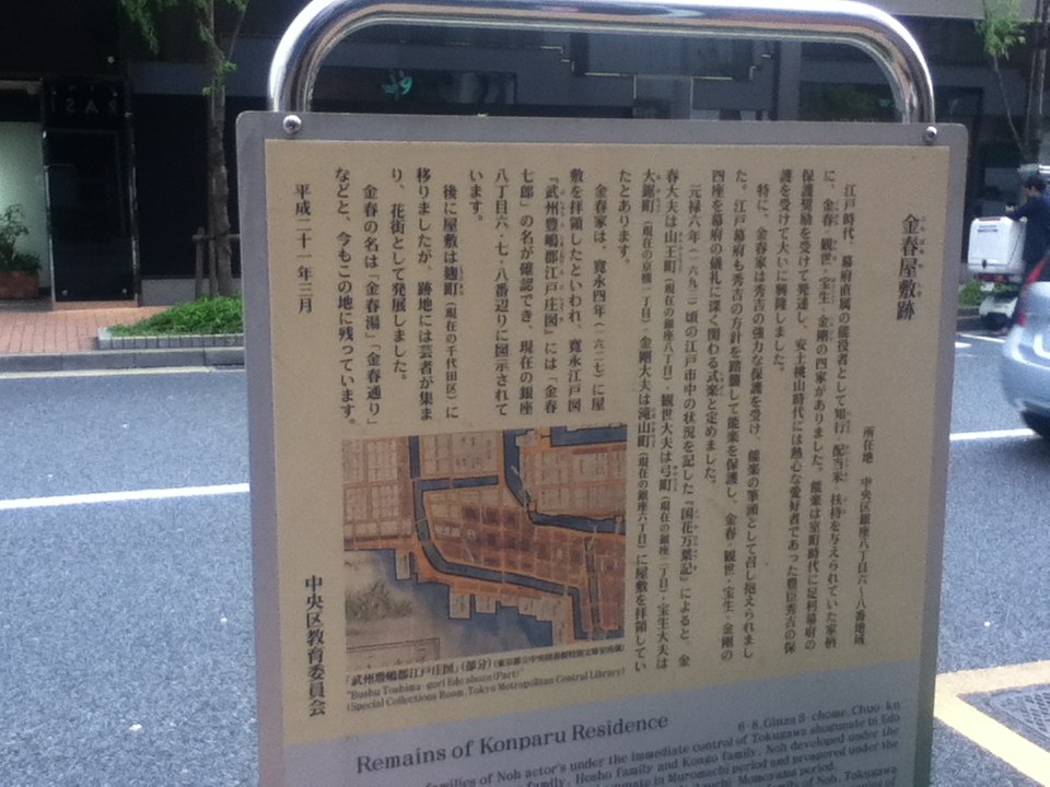 JR新橋駅の北東、銀座の南端を東西に延びる御門通りと金春通りが交差する付近の歩道に、こちらの説明板がある。説明板には、カラーの当時の地図とともに、金春屋敷についてわかりやすく解説されている。平日午後ながら、周りには多くの人が行き来していたが、説明板を見る人はいなかった。説明板のみなので観光要素は少ないが、金春家は室町時代から江戸次代にかけ栄えた、最も伝統ある家で現在の銀座八丁目六、七、八番全域に相当する規模であった。特にこの界隈に関心や知識がある方には、訪問することをお勧めする。