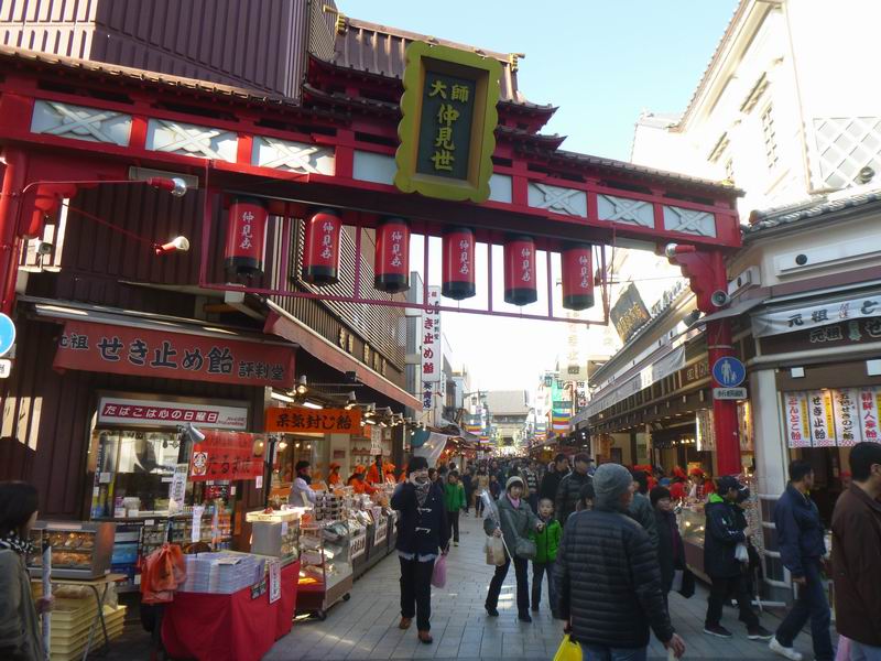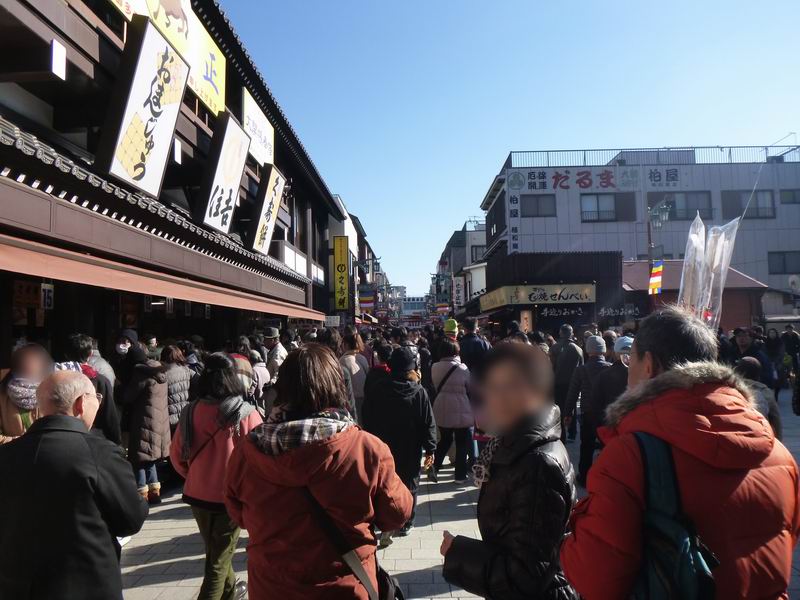 川崎大師の門前にのびる商店街。正月に行ったのでかなりの人出。この時期は一方通行となっていて、初詣を済ませて帰りのみ通れるようになっていました。飴やくず餅を売る店が多いですかね。川崎大師の東側に位置するため、川崎大師駅からはぐるっと遠回りする感じになります。隣の東門前駅も近いと思います。