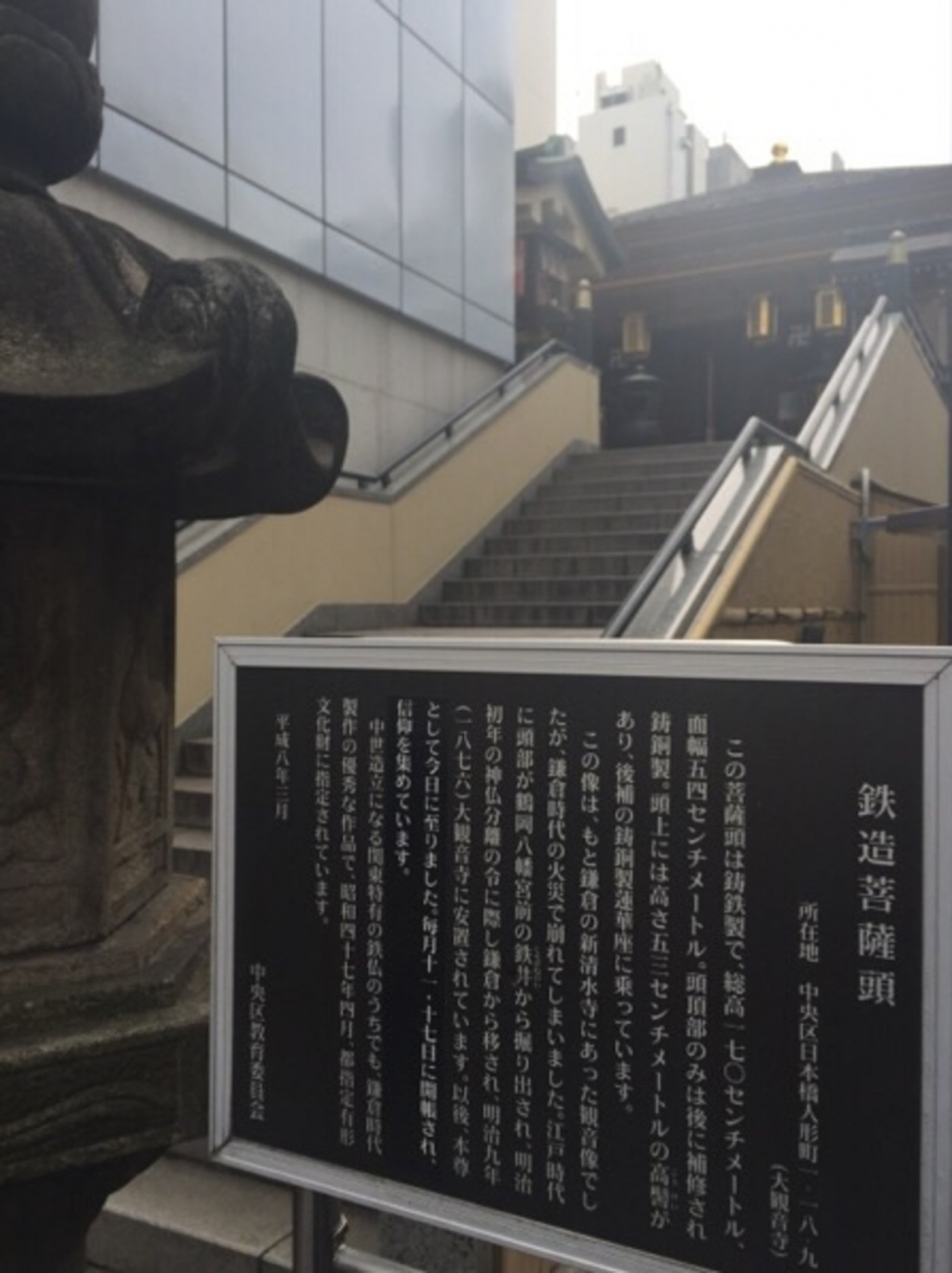 元は鎌倉の新清水寺にありましたが、鎌倉時代に火災に遭い、頭部のみが掘り出され、その後、鶴岡八幡宮にありましたが、神仏分離令により、鎌倉を離れ、明治9年に東京の地に安置されています。