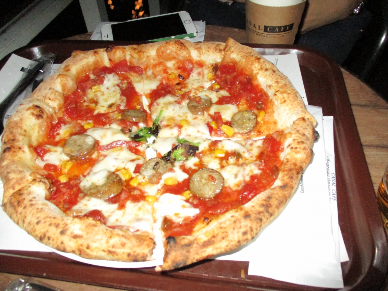 入って左側がレストランで右側が川にダイレクトに面してテーブルチェアのあるお気楽な場所。デートや記念日でディナーなら左側。川風に吹かれたいなら右。右の川沿いスペースはお気楽と言ってもそれなりのお値段。場所代でしょうか、セルフサービス、プラスチックの使い捨てフォークナイフなのにパック入りサラダが800円、パスタも800円、です。ピザ1600円は2人分あり、メキシカーナが美味しかったです。ピザがお勧め。