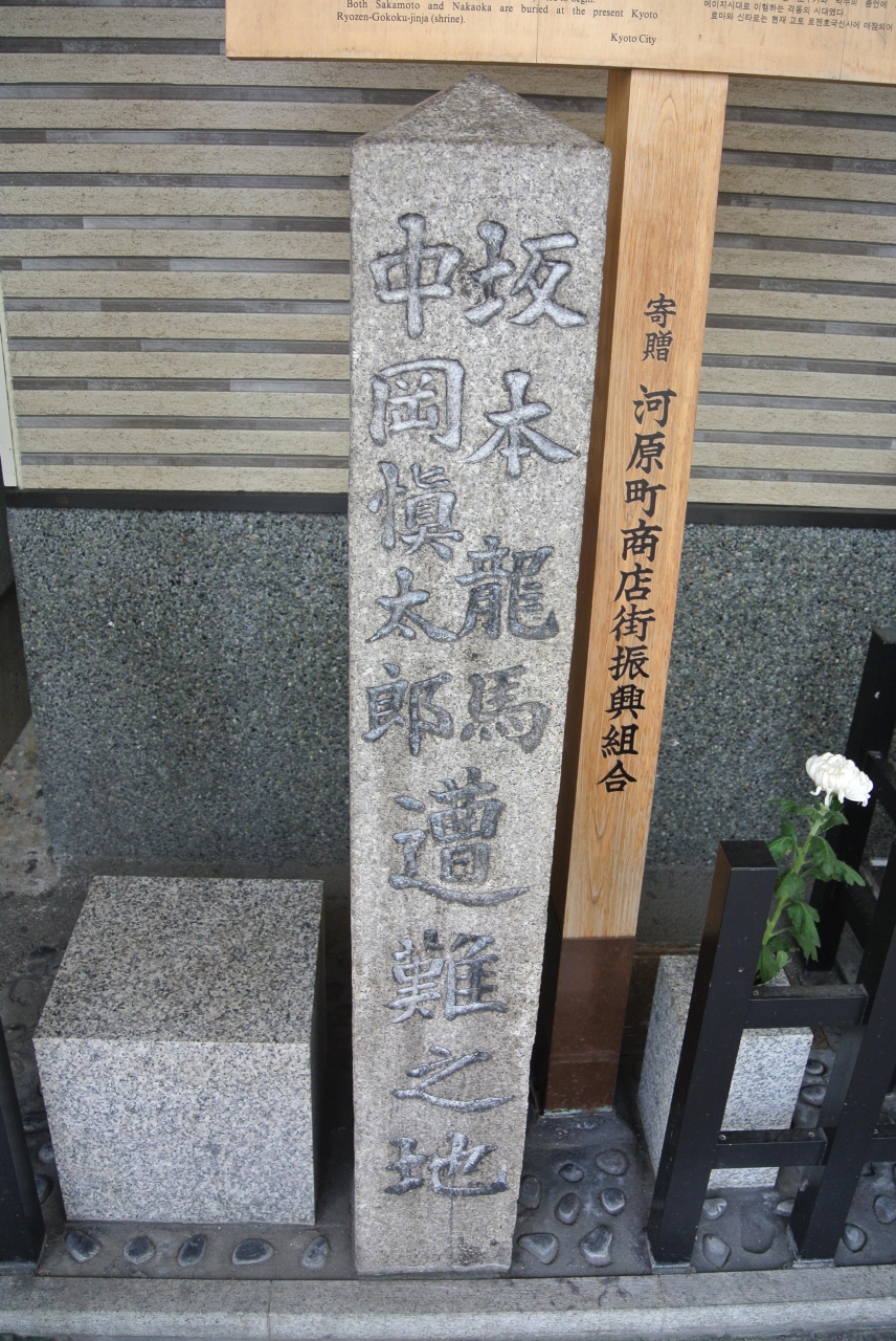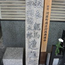 河原町通りの人通りの多い所に立っています。石碑と案内板のみですが、坂本龍馬と中岡慎太郎の暗殺現場である近江屋のあった場所です。当時の様子をうかがわせるものは何も残っていませんが、龍馬ファンなら必ず訪れたいところです。