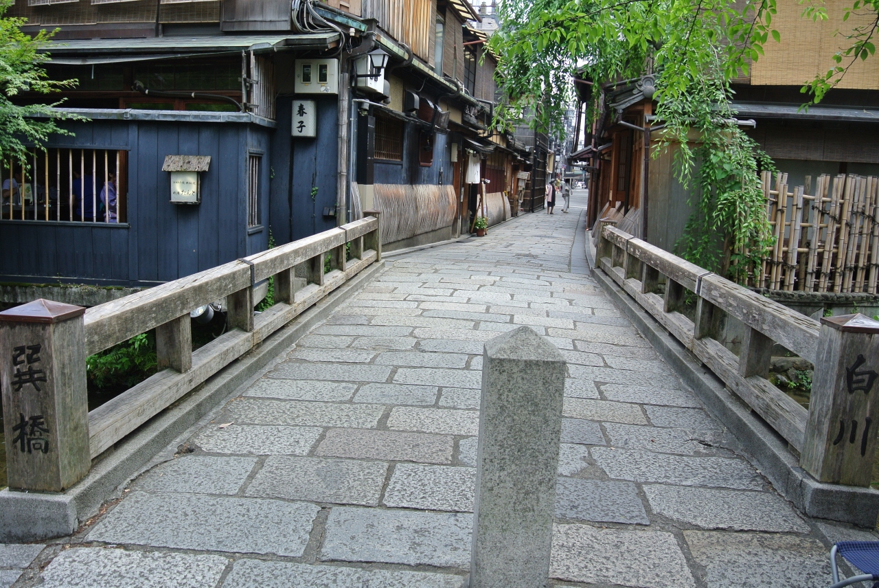 白川にかかる橋ですが、私が行ったときは観光客も少なくて、静かな雰囲気をあじわうことができました。観光客が多くて賑やかなのも活気があっていいですが、静かで落ち着いた風情もまた格別です。川岸の緑も鮮やかでした。