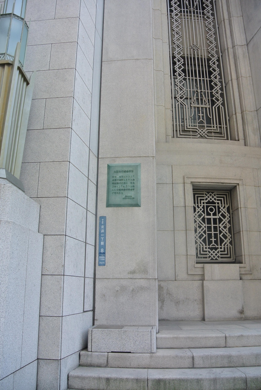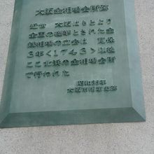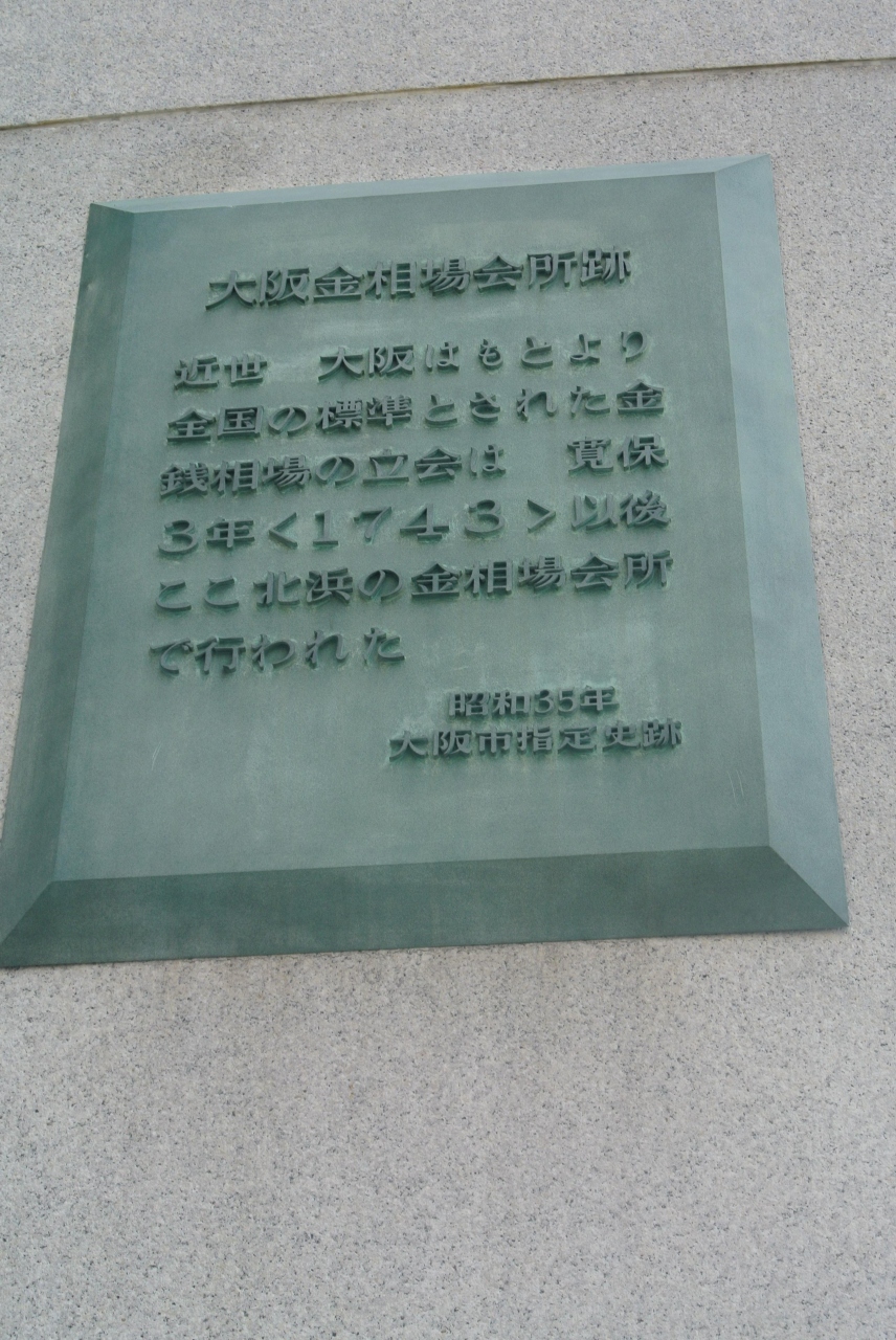 北浜の大阪証券取引ビルの正面入り口の左側の壁にプレートがはめ込まれています。江戸時代の頃からこのあたりは金融関係の大阪の中心地だったということでしょう。江戸時代の活発な経済・商取引の隆盛を物語っています。