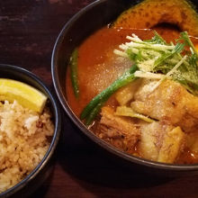 とにかく美味しい!エビのだしが濃厚で、野菜がゴロゴロ、角煮もとても柔らかい。玄米ご飯にレモンがついており、これをしぼるとますます食べやすい。